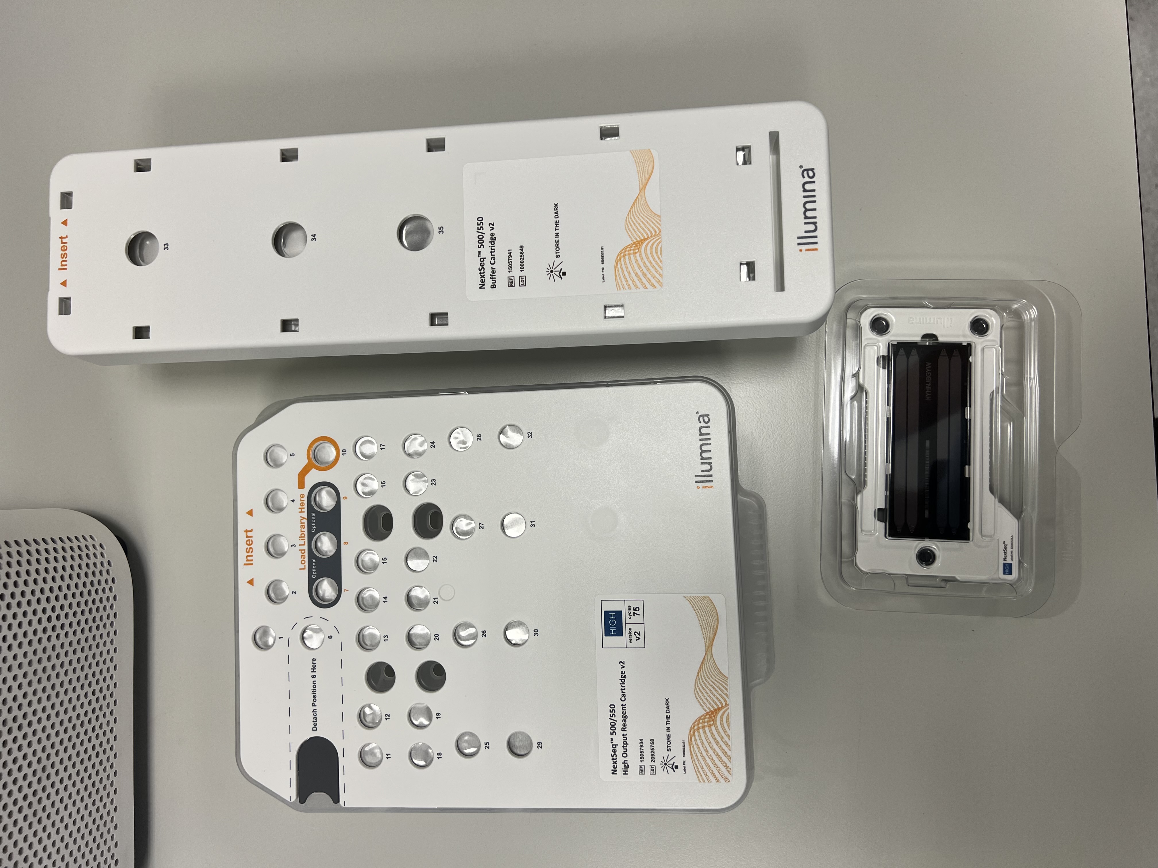 Tak wygląda zestaw odczynników do sekwencjonowania NGS. Ile twoim zdaniem one kosztują? Możesz na tym przeanalizować nawet kilkadziesiąt różnych próbek, ale dodajesz je wszystkie do jednej dziurki ("Load library here"). Masz pomysł skąd potem maszyna wie która była która? Czekam na odpowiedzi w zadaniach kwalifikacyjnych.